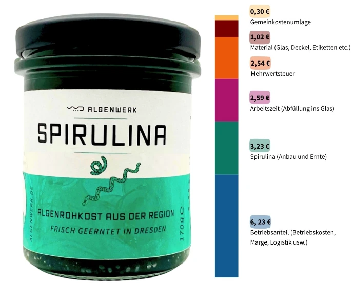 Logistik, Verpackung, Lager, laufende Betriebskosten und ein fairer Deckungsbeitrag, mit dem wir unser ALGENWERK am Leben halten.